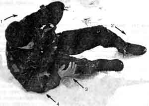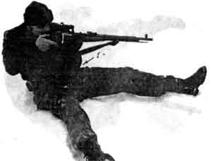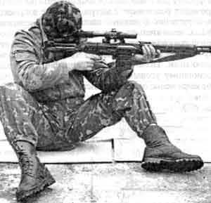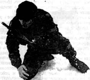При подвижной снайперской работе часто применяется так называемый "бедуинский способ стрельбы" (фото 150). Он заключается в том, что стрелок сидит на ягодицах, правая нога подогнута, а полусогнутая левая нога опирается бедром на ботинок правой ноги (1 на фото 134). Изготовка очень низкая, стрелок почти лежит на винтовке. Левый локоть опирается на левое колено так, как удобно для конкретного стрелка.