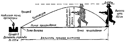 Следовательно, целясь в ноги наступающему пехотинцу с прицелом "6", начиная с дистанции 600 метров и ближе, по мере его приближения, можно стрелять без перестановки прицела. Противник будет поражен сначала в ноги, потом в живот, грудь, голову. По достижении дистанции 300 метров (вершины траектории) противник будет поражаться в грудь, голову, живот и снова в ноги. Способ стрельбы прямым выстрелом удобен в обороне, при отражении атаки противника, когда некогда устанавливать прицел на постоянно меняющиеся дистанции стрельбы, и неважно, куда будет поражен противник (идущих на вас в атаку противников будет очень много), - важно, чтобы он до вас не дошел. В данном случае целить в голову - ненужная роскошь. Важнее стрелять почаще, чтобы атака неприятеля быстрее захлебнулась. Если уж вы хотите "зацепить" противника "покруче", имейте в виду следующее: на дистанции 600 метров пуля упадет в точку прицеливания, то есть по каблукам, и поэтому на этой дистанции нужно целиться повыше, куда-то в область коленей или выше, в пояс, если хотите попасть по центру. Но ближе, на 500 метров, надо стрелять уже по каблукам - траектория сама выведет пулю куда надо. На близкой дистанции, 100 метров, пуля также будет уходить вниз (см. по табл. 8: превышение на такой дистанции будет 53 см), поэтому целиться нужно также выше колен и ниже пряжки, чтобы попасть в грудь. Но на всех остальных дистанциях, от 500 и до 100 метров, по мере приближения атакующего противника точку прицеливания нужно брать только по горизонту, "по каблукам", не меняя установку прицела по высоте. При наступательных действиях при стрельбе легкой пулей из винтовок прямой выстрел получается: