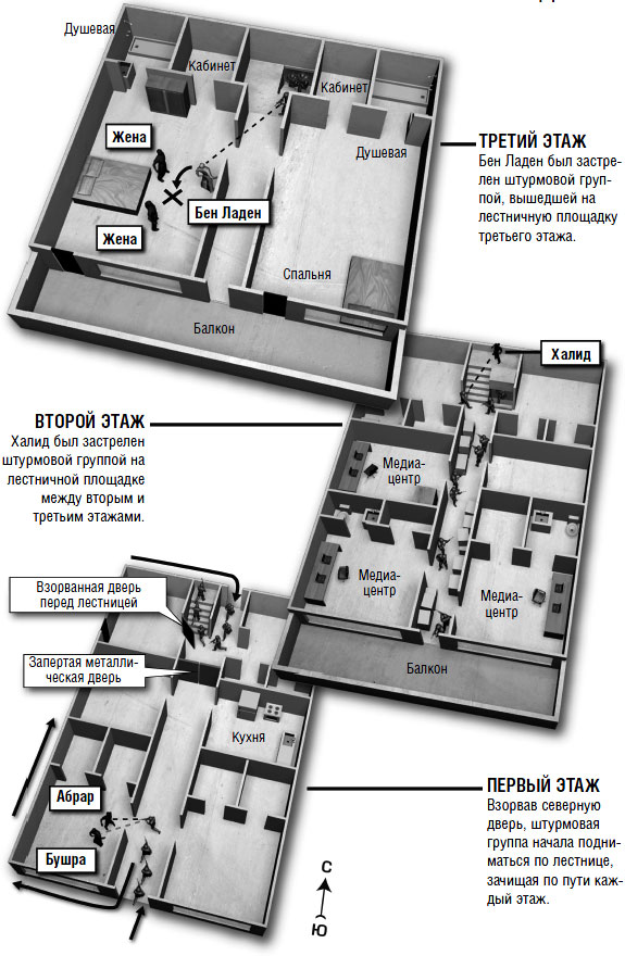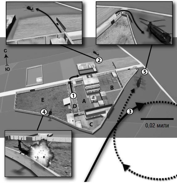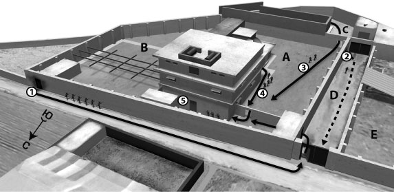 1. Команда второго вертолета взрывает ворота и обнаруживает, что изнутри они заложены кирпичом. Команда перемещается к воротам, ведущим во двор D. 2. Майк, возглавляющий команду первого вертолета, впускает команду второго вертолета через главные ворота. 3. Захватив гостевой дом во дворе С, группа Оуэна перемещается к главному зданию для оказания помощи другим штурмовым группам. 4. Группа Тома, наткнувшись на металлическую дверь в южной части первого этажа, выходит из здания и направляется к северной двери. 5. Чарли устанавливает заряд взрывчатки на северной двери и ждет приказа Тома.