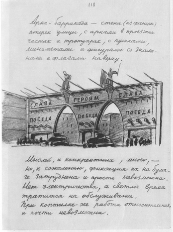 Академик архитектуры А. Никольский суровой блокадной порой рисовал в дневнике арки Победы для будущей встречи воинов.