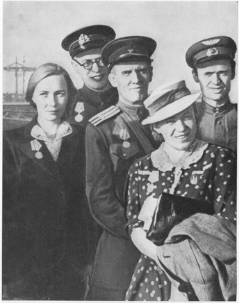 Вручены медали «За оборону Ленинграда». Слева направо: О. Берггольц, Вс. Азаров, Н. Тихонов, В. Инбер, И. Авраменко.