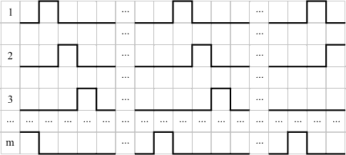 датчика сигналов, вырабатывающего последовательность импульсов, равномерно распределенную во времени по своим шинам (рис. 4.2) (n - общее количество управляющих сигналов, необходимых для выполнения любой операции; m - количество тактов, за которое выполняется самая длинная операция); блока управления операциями, осуществляющего выработку управляющих сигналов, то есть коммутацию сигналов, поступающих с ДС, в соответствующем такте на нужную управляющую шину; дешифратора кода операций, который дешифрирует код операции команды, присутствующей в данный момент в регистре команд, и возбуждает одну шину, соответствующую данной операции; этот сигнал используется блоком управления операциями для выработки нужной последовательности управляющих сигналов.