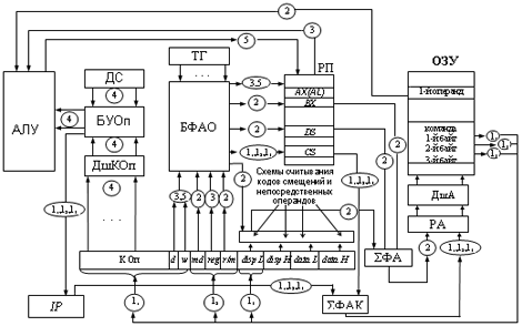 Структура такого компьютера приведена на рис. 10.1. В составе ЭВМ кроме традиционных устройств компьютера с классической архитектурой (оперативное запоминающее устройство, арифметико-логическое устройство и основные схемы устройства управления) выделим следующие блоки: · регистровая память; · блок формирования адреса операнда (БФАО); · двадцатиразрядные сумматоры для получения физических адресов данных (