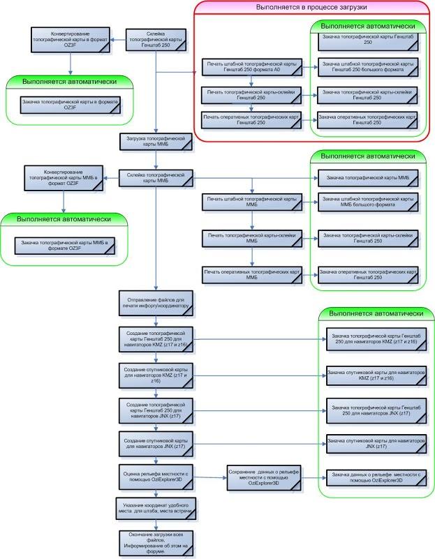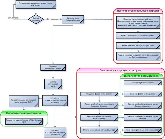 Вышеуказанные этапы приведены условно. Т.к. часть работы можно и нужно делать параллельно. Например, процесс загрузки карт на район поиска может занять продолжительное время. Логично в течении этого времени заняться другими задачами на создание комплекта карт в т.ч. организационного плана. Часть задач может быть выполнена без вашего прямого участия (при использовании программ синхронизации). В целом, процесс создания комплекта карт представлен на рис.1-2. На мой взгляд, нужно стремиться к тому, чтобы необходимый комплект карт готовился и заливался на сервер за 20-30 минут, для простых случаев, и до 1 часа в сложных случаях. Это время позволит вам с одной стороны сделать карты качественно, а с другой стороны выезжающим и выехавшим поисковикам скачать их дома / в дороге. Если карты будут делаться несколько часов — то первые группы будут работать в слепую. А фактор времени нам очень важен...