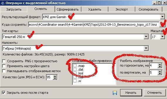 Процесс создания карты может занять некоторое время. Не тратьте его зря — сделайте заливку карт для навигатора. Данные карты заливаются только в навигаторы и позволяют группам, находящимся в лесу, привязываться к относительно новым и достоверным картам. Для поиска необходимо подготовить следующие карты ● Векторную топографическую карту ММБ; ● Растровая спутниковая и топографическая карта KMZ; ● Растровая спутниковая и топографическая карта JNX (для пропаченых навигаторов); Сохранять файлы заливки рекомендуется в папки “2012-09-13_Bereznecovo\4Coordinator_search\4-4Garmin\”. Создайте карты для навигаторов с масштабом 17, но разбивать район поиска следует на 20 кусков. Это необходимо по следующей причине. Навигаторы могут не отобразить большой район поиска с высокой степенью детализации (z17). Но как только район поиска локализован, можно залить именно этот район. Подготовка карт для навигатора в целом похожа на склейку карт для OziExplorer (рис. 13), однако имеет несколько отличий (рис. 42).