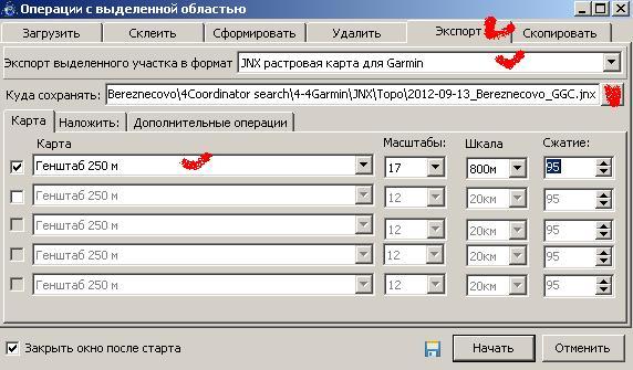 Отрядные навигаторы, и некоторые личные, проапгрейжены и понимают карты формата JNX. Сделайте их также (спутник и Генштаб 250) в приближении z17. Для этого в программе SAS Планета выберите “Операции с выделенной областью”, далее вкладку “Экспорт”, выберите нужный слой (Генштаб 250), приближение. Сохраните карту в ‘4Garmin‘ — “JNX”-“Topo”.
