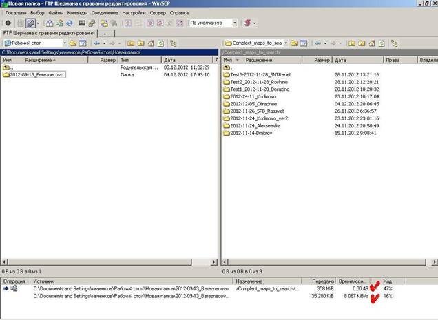 Рисунок 73. Работа в программе WinSCP. Выберите папку “Complect_maps_to_search” (место хранения карт для оперативного поиска); 4 В левом поле выберете папку, которую вы хотите залить на FTP, в правом будет раскрытая папка “Complect_maps_to_search”. Перетяните нужную вам папку с левого поля на правое;
