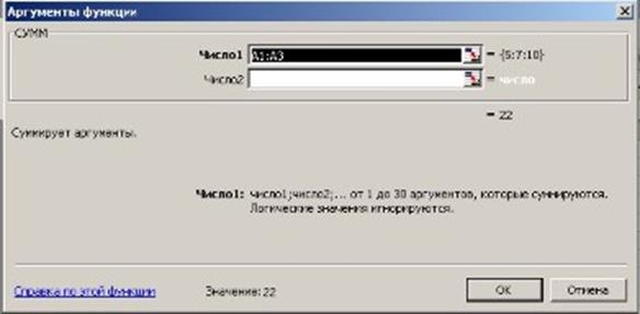 Второе окно диалога мастера функций содержит по одному полю для каждого аргумента выбранной функции. Если функция имеет переменное число аргументов, это окно диалога при воде дополнительных аргументов расширяется. Описание аргумента, поле которого содержит точку вставки, выводится в нижней части окна диалога. Справа от каждого поля аргумента отображается его текущее значение. Это очень удобно, когда вы используете ссылки или имена. Текущее значение функции отображается внизу окна диалога. Нажмите кнопку "ОК" и созданная функция появится в строке формул.