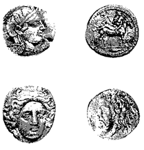 Железо и медь иногда имели форму прута, их сначала называли вертелами [160, с. 46], позже — оболом, а горсть оболов — драхмой. Но это еще не деньги в их прямом виде: настоящие деньги должны иметь на себе государственную печать, гарантирующую их вес и чистоту. Впервые деньги появились в малоазийской части Греции, в Лидии (VII век до н. э.). Их изготовляли из металла, который называли электроном. Это было золото, смешанное с серебром: добывавшееся у реки Пактол золото содержало от 25 до 95 % примеси серебра.