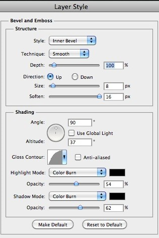 Шаг 8. Теперь добавим стиль слоя Тиснение (Bevel and Emboss). В настройках поставьте тип тиснения Внутренний скос (Inner Bevel), Г лубина (Depth) - 100%, размер 8 пикс., Смягчение (Soften) -16 пикс. А также настройте Угол (Angle) 90º и Высоту (Altitude)- 37º. Измените Контур глянца (Gloss Countou) как на скриншоте и измените режимы наложения для Режима подсветки (Highlight Mode) и Режима тени (Shadow Mode) на Затемнение основы (Color Burn). Поставьте для них чёрный цвет, а также измените Непрозрачность (Opacity).