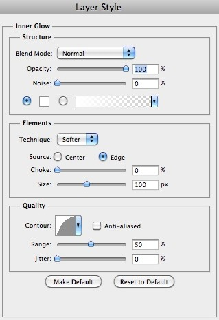 Шаг 9. В этом шаге настроим Внутреннее свечение (Inner Glow). Поставьте Непрозрачность (Opacity) 100%, белый цвет. Затем выберите Источник (Source) - На краях (Edge). Настройте Стягивание (Choke) 0% и Размер (Size) 100 пикс.