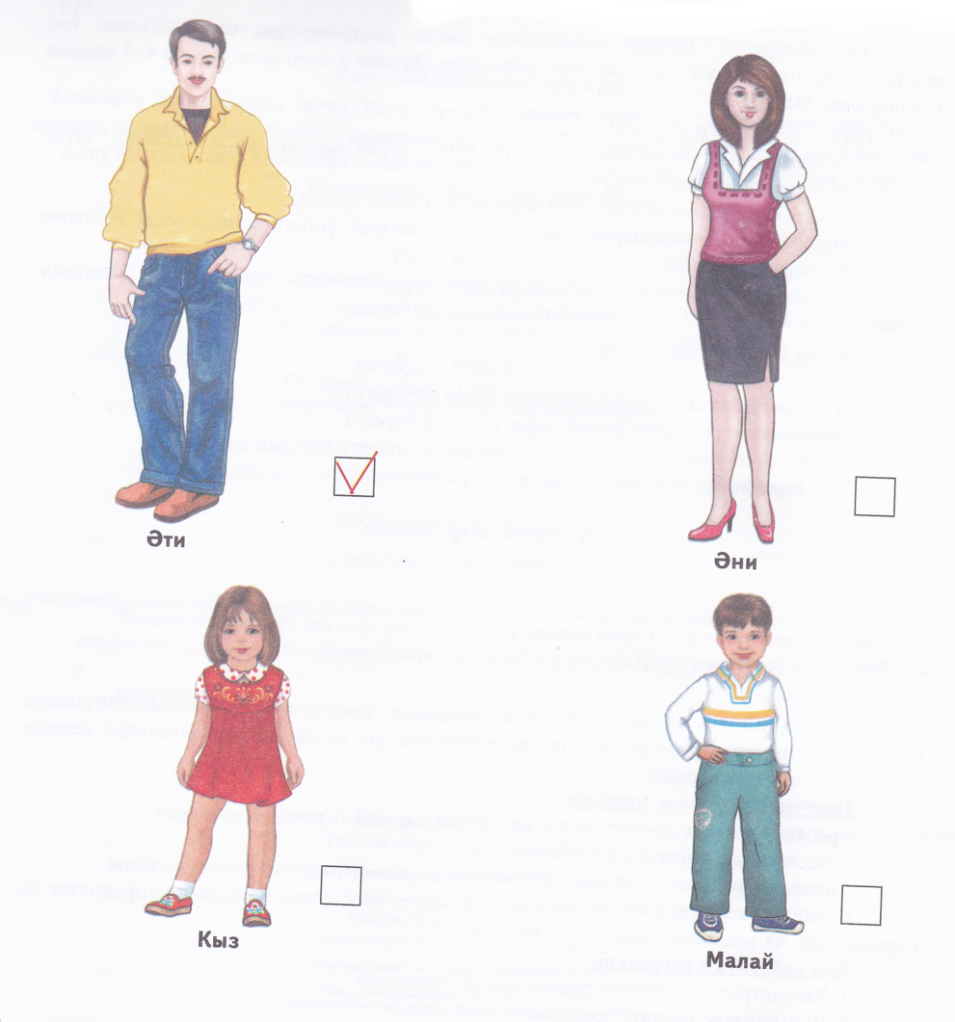 Әби- бабушка, бабай- дедушка, малай- мальчик, кыз- девочка,әни- мама, әти- папа. Родитель закрывает по одному картинки членов семьи по одному рукой и спрашивает: - Кем юк? Ребёнок:Әти (әни, кыз, малай)
