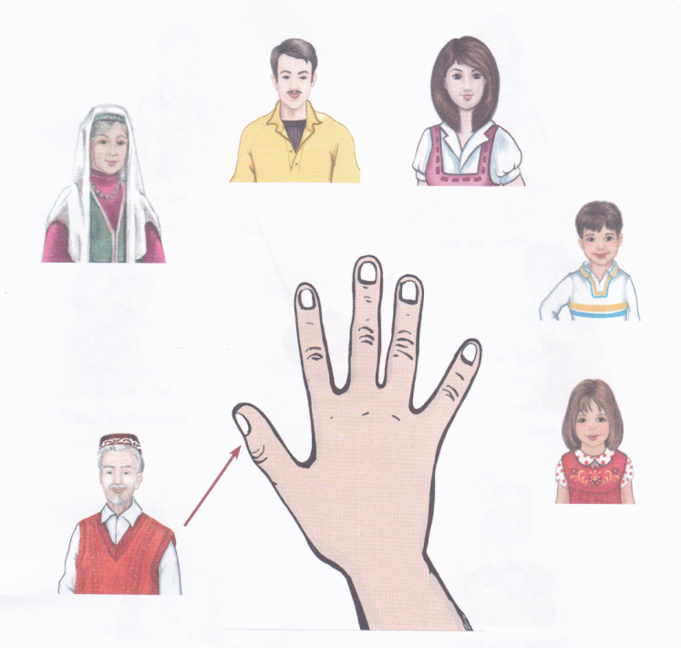 Бу бармак әби, Бу бармак әти, Бу бармак әни, Бу бармак малай (на правой руке).