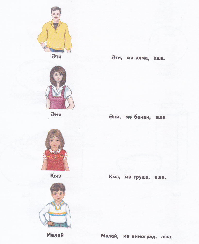 Ребёнок: Әни, мә туп. Әни: Рәхмәт. Коля, Оля, мә туп. Ребёнок: Рәхмәт. Оля, мә туп.