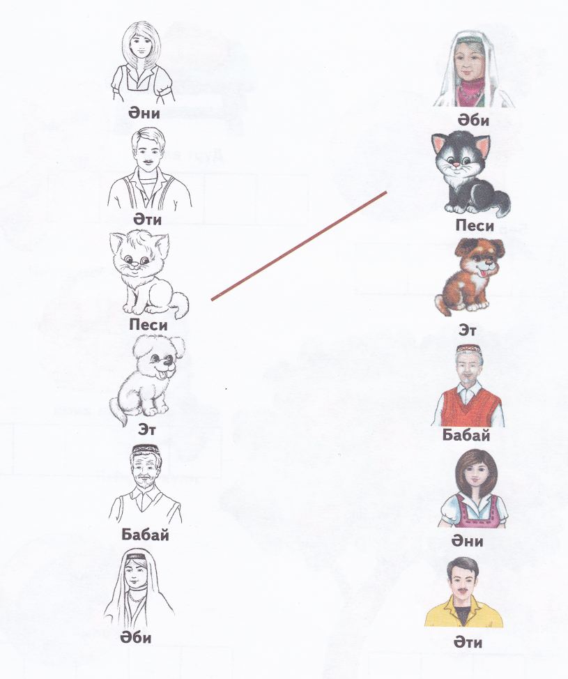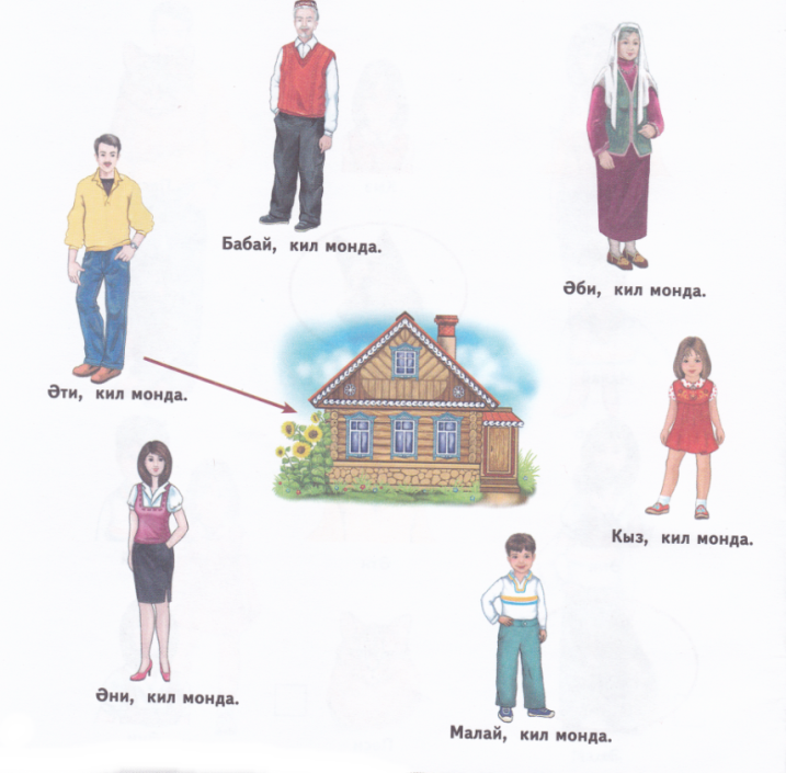 Родитель: Какой красивый дом. Давайте, вспомним кто в этом доме живёт? - Бу кем? Ребёнок: Әти (әни, бабай, әби, кыз, малай). Родитель: Әти (әни, бабай, әби, кыз, малай) нинди? Ребёнок: Зур (матур, әйбәт).