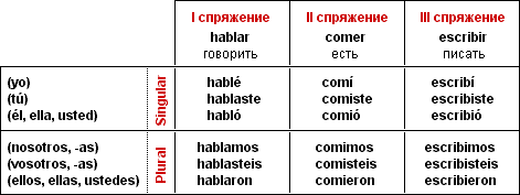 Pret rito Indefinido - прошедшее время - образуется прибавлением к основе глагола следующих окончаний: - , -aste, - , -amos, -asteis, -aron для глаголов I спряжения - , -iste, -i , -imos, -isteis, -ieron для глаголов II и III спряжений.