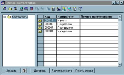 В заголовке окна справочника указывается его название. Если справочник имеет иерархическую структуру, то окно справочника может иметь дерево групп, то есть папок, в которых содержаться соответствующие элементы. Для многоуровневых справочников может включаться /выключаться/ режим для вывода иерархического списка. Эту операцию можно выполнить с помощью кнопки на панели инструментов окна справочника