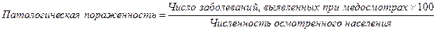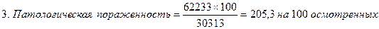 Пример В городе «А» в 2012 году численность населения - 46068, число имеющихся заболеваний 13173, в т.ч. вновь выявленных болезней - 6434. Охвачено медосмотром - 30313, при этом выявлено заболеваний - 62233. Число лиц ни разу не обратившихся в мед. учреждения в течение года 34895. Вычислить показатели распространенности, первичной заболеваемости, патологической пораженности.
