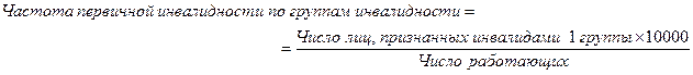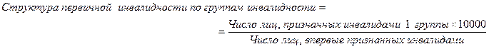 Пример В 2012 году в районе А число работающих – 15115 человек, впервые признаны инвалидами – 66, в т.ч. 1 группы – 15. Число инвалидов, состоящих на учете – 302, в т.ч. по заболеваниям органов кровообращения – 98. Вычислить показатели первичной инвалидности, в т.ч. 1 группы, общую инвалидность(контингент), в т.ч. по заболеваниям органов кровообращения