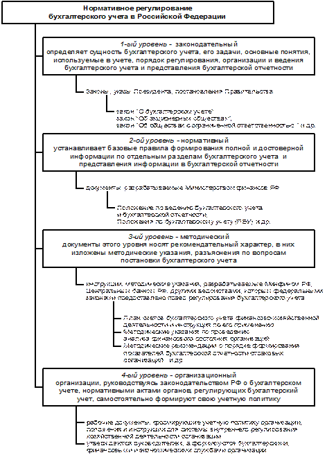 Основная цель стандартов заключается в выработке единого содержания основных принципов и понятий бухгалтерского учета, в достижении единообразного содержания терминологии бухгалтерского учета, едином подходе к построению форм и толкованию показателей финансовой отчетности. Положения по бухгалтерскому учету (документы второго уровня) так же, как и документы первого уровня, носят строго обязательный характер. К третьей группе документов нормативного регулирования бухгалтерского учета относятся методические документы: инструкции; рекомендации; методические указания и разъяснения по применению ПБУ и других документов, подготавливаемые и утверждаемые федеральными органами, общественными объединениями профессиональных бухгалтеров, министерствами и ведомствами на основе и в развитие документов первого и второго уровней. Документы этого уровня носят рекомендательный, разъясняющий и уточняющий характер по отношению к документам более высоких уровней. Рабочие документы, формирующие учетную политику предприятия, а также положения и инструкции, носящие обязательный характер для системы внутреннего регламентирования хозяйственной деятельности организации составляют четвертую группу.