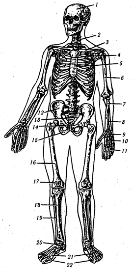 Вид спереди: 1 — череп, 2 — позвоночный столб, 3 — ключица, 4 — ребро, 5 — грудина, б — плечевая кость, 7 — лучевая кость, 8 — локтевая кость, 9 — кости запястья, 10 — пястные кости, 11 — фаланги пальцев кисти, 12 — подвздошная кость, 13 — крестец, 14 — лобковая кость, 15 — седалищная кость, 16 — бедренная кость, 17 — надколенник, 18 — большая берцовая кость, 19 — маалоберцоная кость. 20 — кости предплюсны, 21 — плюсневые кости, 22 — фаланги пальцев стоны