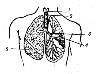 Кровяное давление создается силой сокращения желудочков сердца и упругостью стенок сосудов. Оно измеряется в плечевой артерии. Различают максимальное (или систолическое) давление, которое создается во время сокращения левого желудочка (систолы), и минимальное (или диастолическое) давление, которое отмечается во время расслабления левого желудочка (диастолы). Давление поддерживается за счет упругости стенок растянутой аорты и других крупных артерий. В норме у здорового человека в возрасте 18— 40 лет в покое кровяное давление равно 120/70 мм рт. ст. (120 мм систолическое давление, 70 мм — диастолическое). Наибольшая величина кровяного давления наблюдается в аорте. По мере удаления от сердца кровяное давление оказывается все ниже. Самое низкое давление наблюдается в венах при впадении их в правое предсердие. Постоянная разность давления обеспечивает непрерывный ток крови по кровеносньм сосудам (в сторону пониженного давления). Дыхателная система Дыхательная система включает в себя носовую полость, гортань, трахею, бронхи и легкие. В процессе дыхания из атмосферного воздуха через альвеолы легких в организм постоянно поступает кислород, а из организма выделяется углекислый газ (рис. 2.10 и 2.11). Трахея в нижней своей части делится на два бронха, каждый из которых, входя в легкие, древовидно разветвляется. Конечные мельчайшие разветвления бронхов (бронхиолы) переходят в закрытые альвеолярные годы, в стенках которых имеется большое количество шаровидных образований — легочных пузырьков (альвеол). Каждая альвеола окружена густой сетью капилляров. Общая поверхность всех легочных пузырьков очень велика, она в 50 раз превышает поверхность кожи человека и составляет более 100 м2.