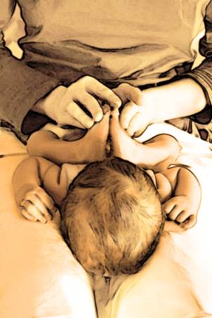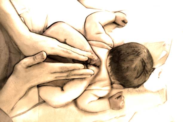Эта поза прекрасно стимулирует пищеварительную систему, освобождает от газов, помогает ребенку опорожнить кишечник, помогает отрыгнуть воздух из желудка, устраняет колики, способствует отхождению мокроты из лёгких, в этой позе можно убаюкать ребенка и мягко положить его спать на животик. Это может сделать кто угодно, для этого не требуется материнской груди. В позе лягушечки ребенок чувствует себя комфортно и защищено – ведь так он жил последнее время в животе мамы, когда там стало достаточно тесно. А с прямыми ногами ему не так удобно, как нам. Ведь его тазобедренные суставы привыкли к другому положению. Попробуйте эту позу, и вы увидите, насколько облегчили жизнь ребенку. Бывает, конечно, что в тазобедренных суставах во время родов произошел зажим, и ребенку трудно принимать это положение. Тогда нужно приходить к этой позе постепенно, понемножку, в этом случае не сразу ребенок сможет спать в этой позе. Однако, именно в этом случае особенно важно ее делать. Она помогает разрабатывать тазобедренные суставы, снять напряжение и зажатость. Она мягко растягивает и разминает, защищая от искривлений в тазовом отделе. Дополнительные асаны для тазобедренного отдела можно делать, только если предыдущие хорошо освоены и не причиняют ребенку никакого дискомфорта. Скорость освоения зависит от изначальной гибкости ребенка. Она определяется генетически и так же зависит от питания матери во время беременности и кормления. Например, у сыроедок часто дети гораздо гибче и с огромным удовольствием делают всевозможные асаны в первые же дни после родов. Верный признак, что ребенку нравится то, что вы с ним делаете – это то, что он сопротивляется направляющему лёгкому давлению, не плачет, расслабляется, начинает серию облегченных вздохов, как бывает у детей после плача, и засыпает в асане. Из асан следует выходить так же мягко, плавно и медленно, как вы с ребенком и входили в асану. Беби-йога. Дополнительные упражнения для раскрепощения тазобедренных суставов 1.