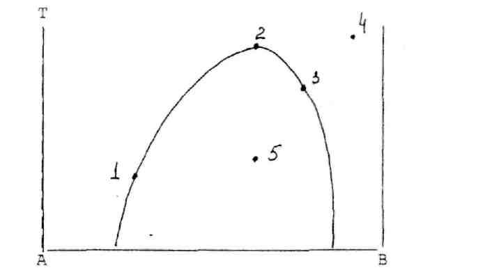 а) определите состав химического соединения и расставьте фазы на фазовых полях. б) определите составы и температуры плавления эвтектических сплавов. в) нарисуйте кривую охлаждения смеси, содержащей 50% В и сделайте вывод о фазовых превращениях, происходящих в системе, укажите их температуры. г) для сплава состава точки 3 рассчитайте количества равновесных фаз, учитывая, что масса всего сплава равна 1 кг. д) определите состав жидкой фазы сплава в точке 3. 7. По приведенной диаграмме: