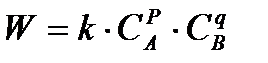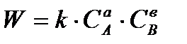 Количественно связь между скоростью реакции и концентрациями реагирующих веществ определяется законом действующих масс: При постоянной температуре, давлении, реакционной среде скорость химической реакции прямо пропорциональна действующим массам – молярным концентрациям реагирующих веществ, взятым в степени соответствующих стехиометрических коэффициентов. Этот основной постулат химической кинетики вытекает из физически очевидного предположения о том, что реагируют те молекулы, которые сталкиваются. Число столкновений зависит от концентрации молекул, поэтому и скорость химической реакции должна определятся теми же факторами.Применение этого принципа приводит к общему выражению для скорости реакции, протекающей по уравнению. аА + вВ → продукты.