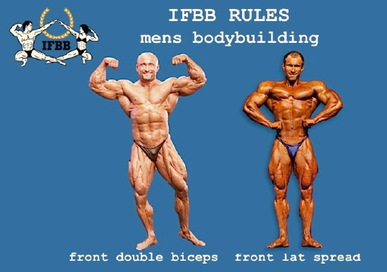 С 2015 года по предложению Исполкома IFBB были утвержден небольшие изменения в обязательных позах, касающиеся категорий «мужской бодибилдинг» и «классический бодибилдинг». 1. «Двойной бицепс спереди» Стоя лицом к судьям, одну ногу отвести вперед в сторону на 40-50 см, участник должен поднять обе руки до уровня плеч и согнуть их в локтях. Кисти рук должны быть сжаты в кулаки и повернуты вниз. Это заставит напрячься мышцы бицепса и предплечий, являющихся основными мышечными группами, оцениваемыми в этой позе. Кроме того, участник должен стремиться напрячь как можно больше мышц, поскольку судьи оценивают все тело. Судья сначала рассмотрит мускулы бицепса, обращая внимание на пик бицепса, его форму, и продолжая обзор на развитие предплечий, дельтовидных мышц, пресса, бедра и ног. Судья будет обращать внимание на плотность мышц, рельеф и сбалансированность. 2. «Широчайшие мышцы спины спереди» Стоя лицом к судьям, расположить стопы в одну линию на расстоянии 15см друг от друга, спортсмен должен положить кисти рук, предпочтительнее сжатых в кулаки, на нижнюю часть талии и «расправить» широчайшие мышцы спины. Спортсмен должен постараться напрячь мышцы груди, рук, пресса. Строго запрещено сильно натягивать плавки. Судья в первую очередь должен оценивать смог ли спортсмен показать «размах» широчайших мышц, создавая торс в форме латинской буквы «V». Затем судья должен оценить всю позу с головы до ног, как в позе 1, отмечая поначалу общие аспекты, а затем концентрируясь на более детальном рассмотрении различных мышечных групп.