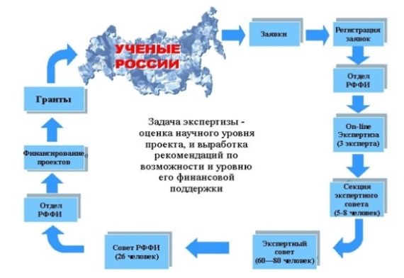 Во все времена актуальной была проблема организации отечественной науки, развития интеллектуального потенциала страны, государственной поддержки российских ученых В настоящий момент уже функционируют государственные фонды, деятельность которых направлена на решение указанного вопроса, такие, как: РФФИ, РГНФ, Совет по грантам Президента РФ, РНФ. Более подробно рассмотрим РФФИ и РГНФ. На основе анализа деятельности двух фондов сделаем вывод о направлениях и возможностях развития научных направлений РФ. Российский фонд фундаментальных исследований (РФФИ) создан указом Президента Российской Федерации от 27 апреля 1992 года № 426 «О неотложных мерах по сохранению научно-технического потенциала Российской Федерации». Он является самоуправляемой государственной некоммерческой организацией в форме федерального учреждения, находящегося в ведении Правительства Российской Федерации. В качестве представителя государства, фонд обеспечивает целевую, адресную, диверсифицированную поддержку передовых групп ученых вне зависимости от того, к какому ведомству они относятся. Поддержка инициативных научно-исследовательских работ по всем основным направлениям фундаментальной науки осуществляется строго на конкурсной основе по результатам всесторонней экспертизы. РФФИ стал первой организацией в научно-технической сфере России, применяющей подобную практику. Каждая заявка проходит в РФФИ независимую, многоэтапную экспертную оценку по каждой из областей знаний, которая схематично представлена на рис. 1.