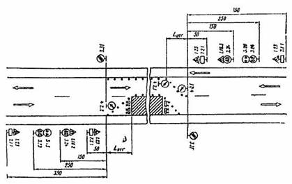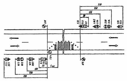 Рис. 3.2. Организация движения и ограждение места дорожных работ, выполненных на половине ширины проезжей час двух полосных дорог. 3.6. На дорогах с разделительной полосой, имеющих четыре и более полос движения, в случае закрытия половины ширины проезжей части на период дорожных работ для пропуска транспортных средств следует устраивать специальные проезды через разделительную полосу. С целью заблаговременного оповещения водителей транспортных средств о предстоящем перестроении вне населенных пунктов за 500 м до разрыва в разделительной полосе устанавливают знак 5.36 “Перестроение в другую проезжую часть” с табличкой 7.1.1. “Расстояние до объекта”. В населенных пунктах знак 5.36 с табличкой 7.1.1 устанавливают на расстоянии 50-100 м от место разрыва в разделительной полосе. 3.7. В случае устройства на двухполосных дорогах уширения проезжей части на полосу движения для обеспечения бесперебойного пропуска транспортных средств на участках дорожных работ длиной более 30 м. 3.8. В целях более полного использования инерции разгона в местах производства работ на затяжных подъемах допускается скорость транспортных средств 60 км/ч, если позволяют условия движения. 3.9. При выполнении дорожных работ на дополнительной полосе на подъеме следует организовать движение и ограждать место работ в соответствии со схемой. Если зона ремонтных работ расположена на расстоянии не более 200 м от начала дополнительной полосы, рекомендуется с помощью ограждающих устройств закрывать эту полосу от ее начала до конца зоны работ.
