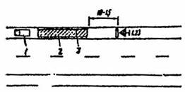 Рис. 3.32. Организация движения и ограждение зоны краткосрочных дорожных работ без сужения проезжей части: 1 - автомобиль; 2 - зона работ 3 - ремонтируемое дорожное ограждение