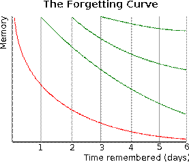 1. Удержание прочитанного во внимании В уроке по тренировке внимания, уже отмечалось, что если вы читаете интересную книгу, скорее всего, прочитанное вам будет запомнить легче, чем в том случае, если вы читаете скучный для вас учебник. Казалось бы, банальная истина, однако стоит обратить внимание на несколько свойств, которые способствуют лучшему усвоению интересного текста: Эмоциональность. Интересный текст вызывает в вас эмоции, которые всегда помогают лучшему запоминанию. Наиболее яркие (эмоциональные) моменты человек запоминает на всю жизнь. Эмоции, вызванные текстом, также помогают запомнить его смысл или конкретные факты даже дословно. Визуализация. Если книга вам интересна, то во время чтения вы погружаетесь в смысл прочитанного. Это погружение характерно тем, что организм пытается репродуцировать текст в зрительных образах, привлекая к восприятию также и другие органы чувств. Таким образом, интересный текст визуализируется, приобретает звучание (что для быстрого чтения не очень хорошо), и вы можете ассоциировать его с определенными кинетическими, вкусовыми и обонятельными реакциями вашего организма. Текст, который воспроизводится различными органами чувств, запоминается лучше, так как имеет больше чувственных ассоциаций, а, следовательно, больше факторов, которые помогут его вспомнить в нужный момент. Итак, для лучшего запоминания текста можно пользоваться теми же приемами, что и для тренировки внимания при чтении. Кроме того, в предыдущем уроке есть упражнения на улучшение восприятия и понимания прочитанного текста, что также поможет повысить эффективность его кратковременного запоминания. 2. Долговременное запоминание Проведенные учеными исследования показывают, что долговременное запоминание текста происходит путем не столько его осмысления и визуализации, сколько при помощи многократного повторения. Причем важнее всего не количество повторений (пересказов или сеансов воспоминаний) прочитанного, а правильные интервалы между ними. Еще в XIX веке немецкий ученый, психолог-экспериментатор, Герман Эббингауз выявил, так называемую, «кривую забывания» или «кривую Эббингауза», которая показывает как происходит процесс забывания информации: