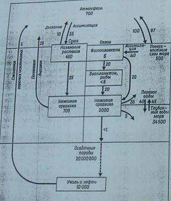 Круговорот углерода: Цикл состоит из 2 составляющих: атмосфера и океан. Длительность круговорота – 5 тыс.лет. Цикл замкнутый, хотя может длиться длительное время. Работа экосистемы по выводу отработанных углеродистых веществ в геолог.круговорот за 1 цикл – 650 тыс.лет. Всего за 600 млн.лет фанерозоя ~ 100 тыс.циклов C, что привело к образованию 1016-1017 т.C в стратосфере (осадочные отложения). Круговорот, идущий в океане, в основном автономен. Двуокись углерода, растворенная в морской воде, усваивается фитопланктоном, а кислород уходит в раствор. Зоопланктон и рыбы потребляют углерод, фиксированный фитопланктоном, а кислород используют при дыхании. В результате разложения органических веществ в воду возвращается двуокись углерода, усвоенная фитопланктоном. Круговорот кремния: Магма, которая состоит в основном из оксидов кремния, выливается на поверхность Земли и застывает-получается магматическая порода. Постепенно она выветривается — этому способствуют химические, физические и биологические факторы, а воды сносят кремнезем в пониженные места, большей частью в моря и о к е аны. Образуются мощные слои осадочных пород, которые со временем погружаются на большие глубины и там, при повышенных давлениях и температурах, частично переплавляются и превращаются снова в магму. А потом круговорот повторяется, поскольку магма снова стремится в верхние горизонты земной коры.