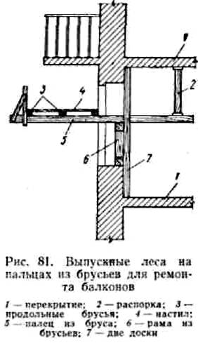 Выпущенные через окна пальцы опираются на рамы из брусьев, устанавливаемые в проемах окон и дверей. В зависимости от высоты рамы уровень рабочего настила лесов может отстоять от плиты балкона на различной высоте от 0,6 до 1,8 м. Ремонт венчающих карнизов и парапетов заключается в большинстве случаев в смене отдельных участков. Если кладка карниза выполнена в виде напусков кирпича, то поврежденные участки следует разобрать, а образовавшиеся гнезда очистить от щебня и раствора, смочить водой и заделать новым кирпичом на цементном или сложном растворе с перевязкой швов как в новой кладке, так и в сопряжениях со старой кладкой. Если карниз состоит из кирпичной кладки, поддерживаемой железобетонной плитой, то при потере плитой несущей способности карниз должен быть полностью разобран, с последующей заменой плиты и кирпичной кладки карниза. При повреждениях карнизов из керамики разрушенные блоки следует заменить новыми. При отсутствии керамических блоков их можно сделать из бетона с цветной фактурой, соответствующей цвету заменяемых керамических блоков.