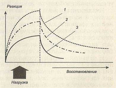 Рис. 36. Реакция организма спортсменов различной квалификации на одинаковую по объему и интенсивности работу: 7 — спортсмены II разряда; 2 — спортсмены I разряда; 3 — мастера спорта (по В. Н. Платонову, 1995) Следует учитывать, что по мере выполнения длительной работы различной интенсивности происходят не столько количественные, сколько качественные изменения в деятельности различных органов и систем. Соотношение интенсивности нагрузки (темп движений, скорость или мощность их выполнения, время преодоления тренировочных отрезков и дистанций, плотность выполнения упражнений в единицу времени, величина отягощений, преодолеваемых в процессе воспитания силовых качеств и т.п.) и объема работы (выраженного в часах, в кило метрах, числом тренировочных занятий, соревновательных стартов, игр, схваток, комбинаций, элементов, прыжком и т.д.) изменяется в зависимости от уровня квалификации, подготовленности и функционального состояния спортсмена, его индивидуальных особенностей, характера взаимодействия двигательной и вегетативной функций. На пример, одна и та же по объему и интенсивности работа вызывает различную реакцию у спортсменов разной квалификации (рис. 36). Более того, предельная (большая) нагрузка, пред полагающая, естественно, различные объемы и интенсивность работы, но приводящая к отказу от ее выполнения, вызывает у них раз личную внутреннюю реакцию. проявляется это, как правило, в том, что у спортсменов высокого класса при более выраженной реакции на предельную нагрузку восстановительные процессы протекают интенсивнее (рис. 37)