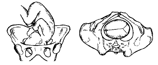 Первый момент - сгибание головки - происходит на границе широкой и узкой части малого таза (рис. 31). По мере сгибания и опускания затылка малый родничок устанавливается ниже большого и является проводной (ведущей) точкой (самая низко расположенная точка на головке, первой проходящая плоскости таза). Головка проходит плоскости таза малым косым размером, имеющим диаметр 9,5 см - от переднего угла большого родничка до подзатылочной ямки, и окружность 32 см. Стреловидный шов пальпируется в поперечном или в одном из косых размеров малого таза.