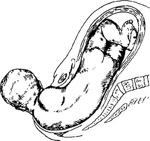 Второй момент - внутренний поворот головки - совершается вокруг продольной оси в узкой части полости таза и обусловлен формой родового канала (рис. 32). При этом затылок приближается к лонному сочленению. Стреловидный шов из поперечного или одного из косых размеров переходит в прямой размер плоскости выхода малого таза. Подзатылочная ямка устанавливается под лонным сочленением и образует первую точку фиксации. Клиническим проявлением завершенного внутреннего поворота является врезывание головки в вульварное кольцо. Третий момент - разгибание головки - происходит в плоскости выхода таза (рис. 33). Мышечно-фасциальный отдел тазового дна способствует отклонению головки плода к лону. Головка разгибается вокруг точки фиксации. Клинически этот момент соответствует прорезыванию и рождению головки.