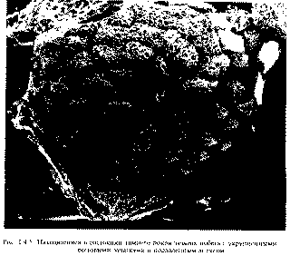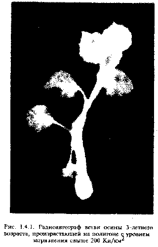 Рис.1.4.1. Радиоавтограф ветви осины 3-летнего возраста, произрастающей на полигоне с уровнем загрязнения свыше 200 Ки/км2 Результаты наблюдений в 1986 - 1992 гг. над характером вертикальной миграции радионуклидов по почвенным горизонтам различных почв на фиксированных полигонах в 30-километровой зоне ЧАЭС, показали, что независимо от типа почв и характера надпочвенного покрова, основные их количества фиксированы в верхнем 1 - 5-сантиметровом слое почвы. Однако в последние годы отмечается тенденция к увеличению скорости вертикальной миграции, проявляется зависимость распределения радионуклидов от генетических особенностей почв, характера почвенного покрова, степени увлажненности. Так, в результате вертикальной миграции к концу вегетационного периода 1992 г. радионуклиды в доступных для измерений концентрациях мигрировали в слой 15 - 20 см минеральной части почв. Наибольшая скорость миграции радионуклидов по нисходящей в торфяных, лугово-болотных, луговых почвах. Низкой подвижностью137Cs характеризуется в дерновых слабоподзолистых глинисто-песчаных почвах. На занятых лесами территориях около 85 % радионуклидов продолжает оставаться в подстилке. Таким образом, основное количество радионуклидов сосредоточено в слое почвы 0 - 5 см. Здесь за весь период наблюдений запас137Cs снизился на 12 %, в том числе за последние 2 года на 8 %, а в нижележащих слоях - увеличился: в слое 5 - 10 см на 1,5 %, в слое 10 - 15 см - на 0,5 %. Миграция137Cs no профилю почвы происходит приблизительно на 1 см в год. Рассчитанные значения коэффициентов квазидиффузии137Cs лежат в пределах 1,6·10-9 см2/с для дерновых слабоподзолистых глинисто-песчаных почв и 3,5·10-9 см2/с для торфяных маломощных. Отсутствие или наличие лесной подстилки на почве в сосновом или березовом лесу существенно отражается на миграции137Cs и с листового березового или хвойного соснового опада в поверхностный слой почвы. Период полупотерь137Cs из свежего опада, помещенного на почву с подстилкой. - 5 сут. а на почве без подстилки - 45 сут.
