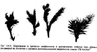 Рис. 1.4.4. Нарушения в процессе морфогенеза у вегетативных побегов ели, произрастающей на полигоне с уровнем радионуклидного загрязнения свыше 150 Ки/км- Свето-микроскопические исследования побегов, на которых выявлены нарушения формообразовательных процессов, показали [24], что развитие латеральных почек в этом случае заторможено, а организация терминального апекса нарушена. Наблюдалась элиминация зоны центральных материнских клеток и переходной зоны; клетки периферической зоны формировали значительную часть почки; закладка кроющих чешуи модифицировалась. Верхушки побегов с укороченными стеблями и хвоей не имели терминальной почки - ее замещали несколько латеральных. При сканировании находящихся в состоянии зимнего покоя зачатков побегов 1987 - 1988 гг. на их расширенном основании регистрировали существенное изменение апикальной части, утолщение купола зачатка, на ее месте в зачатке образовывалось углубление, размеры которого варьировали (рис. 1.4.5). Таким образом, при остром и хроническом облучении у многолетних растений, произрастающих в насаждениях вокруг ЧАЭС, зона Центральных материнских клеток с низким уровнем митотической активности оказывалась более радиочувствительной, чем инициальный слой и периферическая зона, где уровень митотический активности выше, что ведет к тератогенезу. Вид и размеры формирующихся терат зависят, по-видимому, от поглощенной дозы.
