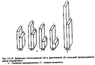 Рис. 1.4.10. Динамика потенциальной (Г) и фактической (2) семенной продуктивности рогоза узколистного: а -Киевское водохранилище; б -водоем-охладитель