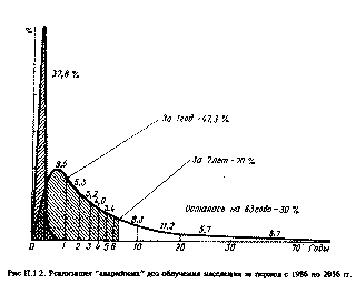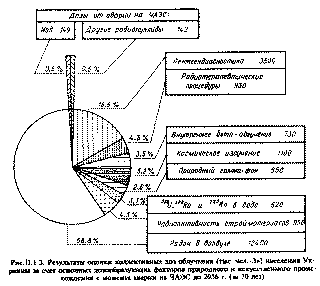 Оценка коллективных (популяционных) доз облучения населения Украины (52 млн чел.) за период с момента аварии до 2056 г. (рис. II Л. 3) показывает, что основным дозообразующим фактором является Rn в воздухе жилых помещений (около 60 % дозы). Это связано с геологическими особенностями территории, с этническими аспектами планировки сельских жилых зданий и т.д. Авария на ЧАЭС дает вклад в коллективную дозу облучения населения не более 2 %. При этом расчет доз производился с учетом возрастной структуры населения и при условии неизменности ее на протяжении 70-летнего периода (так называемые популяционные дозы). Величина этой дозы на все население составит не более 300 тыс. чел.-Зв.