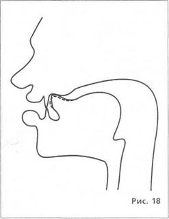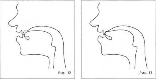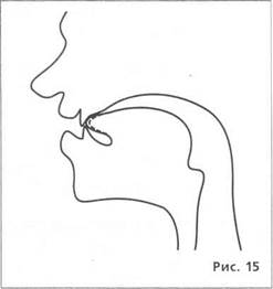 Произношение звука [с]: Губы вытянуты в улыбку, зубы сближены в форме нормального прикуса. Боковые края языка прижаты к коренным зубам. По средней линии языка образуется желобок, по которому, как в свисток, идет воздушная струя. Кончик языка может упираться как в нижние, так и в верхние резцы. Струя воздуха четко подается в самые зубы (рис. 12, 13). Звук [с] должен звучать тонким свистом, если к свисту прибавляется некий более грубый шум, значит, звук произносится неправильно. Звук [з] произносится так же, только добавляется звук голоса. Звук [ц] {рис. 14, 15) образуется в результате быстрого последовательного произнесения звуков [т] и [с] ([тс]).