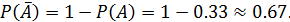 Сумма всех вероятностей событий выборочного пространства равняется 1. Например, если экспериментом является подбрасывание монеты при Событии А = «орел» и Событии В = «решка», то А и В представляют собой все выборочное пространство. Значит, Р(А) +Р(В) = 0.5 + 0.5 = 1. Пример. В ранее предложенном примере вычисления вероятности извлечения из кармана халата красной ручки (это событие А), в котором лежат две синих и одна красная ручка, Р(А) = 1/3 ≈ 0.33, вероятность противоположного события – извлечения синей ручки – составит