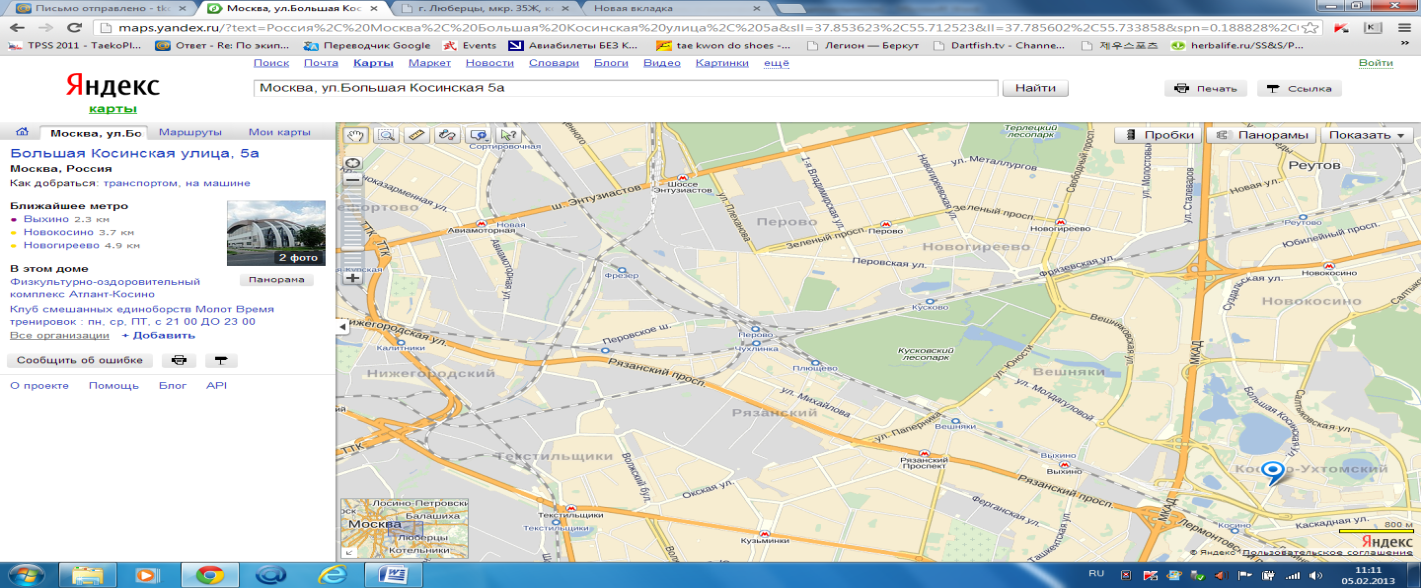 ПРОГРАММА проведения Го ОТКРЫТОГО турнира КЛУБА ТХЭКВОНДО БЕРКУТ Февраля 2015 года. 07.30. – 08.30. – мандатная комиссия для представителей регионов, кроме Москвы и Московской области. 09.30. – 14.00. – поединки среди МЛАДШИХ ЮНОШЕЙ и ДЕВУШЕК 2004-06гг.р. в КАТЕГОРИИ НАЧИНАЮЩИЕ до 5 гыпа включительно (за исключением опытных участников открытых турниров – 5-8 место и выше не допускается) 14.00. – 15.00. – перерыв 15.00. – 20.00. – поединки среди МЛАДШИХ ЮНОШЕЙ и ДЕВУШЕК 2004-06гг.р. БЕЗ ОГРАНИЧЕНИЙ уровня подготовки. ПРИЛОЖЕНИЕ 2. Месторасположение спорткомплекса АТЛАНТ, ул.Большая Косинская 5А. Метро «Выхино» авт.602, 79 или маршрутка 602Н до АТЛАНТА. Или м. «Новокосино» авт.723, 773 или маршрутка 723. Также можно от станции «Косино» Казанской ж/д и далее авт 722, 747, 723 одна остановка в Москву.