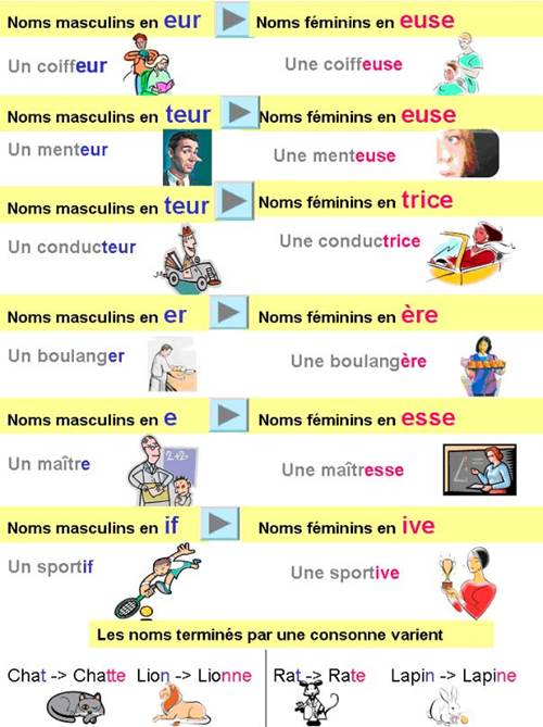 Женский род образован другим словом Два разных слова (с разными корнями или вариантом корня мужского рода): un homme / une femme - мужчина /женщина un père / une mère - отец /мать un frère / une sœur - брат /сестра un oncle / une tante - дядя /тетя. un coq / une poule - петух /курица un bœuf / une vache - бык /корова un époux / une épouse - супруг /супруга un neveu / une nièce - племянник/племянница un copain / une copine - приятель /приятельница un roi / une reine - король /королева un empereur/ une impératrice-император/императрица un loup / une louve - волк/волчица Date: 2015-09-17; view: 442; Нарушение авторских прав |