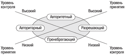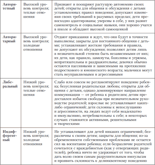 Наиболее деструктивное влияние на поведение ребенка оказывает пренебрегающий (индифферентный) стиль, когда родители настолько озабочены собой и своими проблемами, что их дети чувствуют себя брошенными, поскольку родители не удовлетворяют их потребности и интересы. Это ощущение может оставаться у них на всю жизнь. Подростки в таких семьях становятся более импульсивными и антисоциальными, менее ориентированы на достижения, плохо учатся в школе (А. Бандура и Р. Уолтерс [75]). Д. Бомрид отмечает, что при авторитарном и либеральном стилях воспитания результат один и тот же – ребенок менее компетентен в социальном и когнитивном плане, так как и в том и в другом случае родители стремятся оградить ребенка от сложностей жизни. Только достигается этот негативный результат разными путями: авторитарные родители строго регламентируют поведение ребенка, из‑за чего у того появляется мало шансов столкнуться с жизненными трудностями, и он не учится их преодолевать. Либеральные родители, наоборот, поощряют детей к новой деятельности, но не реагируют негативно на их отклоняющееся поведение и, следовательно, тоже не учат их иметь дело с негативными ситуациями. Авторитетное воспитание ведет к тому, что дети перенимают ценности своих родителей, в то время как при авторитарном и снисходительном стилях воспитания формируются ценности, отличные от родительских (Кларк с соавторами [76]).