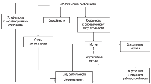 21.5. Учет этапа овладения профессиональным мастерством Важно также учитывать, что на разных этапах овладения профессиональным мастерством, адаптации к условиям деятельности ее эффективность может зависеть от различных и даже противоположных типологических особенностей проявления свойств нервной системы. А. И. Фукин (1995) показал, что на начальном этапе профессиональной адаптации слесарей‑сборщиков конвейерного производства больших успехов добиваются те, кто имеет скоростной типологический комплекс, а после пяти лет работы – уже обладающие типологическим комплексом устойчивости к состоянию монотонии. В. П. Мерлинкин и М. Е. Бубнов (1977) установили, что темпы обучения двигательным навыкам сначала выше у лиц с подвижной и лабильной нервной системой, но затем инертные догоняют «подвижных», и качество навыка становится у тех и других одинаковым. Другой исследователь – Р. Р. Гучетлев (1981) – обнаружил в принципе ту же закономерность, только относительно переделки суточного стереотипа: быстрее это совершают люди, отличающиеся подвижностью нервных процессов, но потом инертные их настигают, и уровень адаптации становится у двух групп равным. Как установили В. А. Сальников и Б. В. Кимейша (1982), на начальном этапе тренировочного процесса наибольшие темпы возрастания спортивных результатов были у штангистов, имевших сильную нервную систему и преобладание возбуждения по «внутреннему» балансу, т. е. типологические особенности, обеспечивающие высокую двигательную активность, работоспособность, терпеливость. Однако на следующих этапах более быстрый рост результатов отмечался уже у штангистов со слабой нервной системой, инертностью нервных процессов, так как эти особенности, с одной стороны, влияют на устойчивость к монотонности тренировочных нагрузок, а с другой – обеспечивают лучшую двигательную память (инертность нервных процессов) и координацию движений (слабая нервная система). У них же дольше сохранялась перспектива достижения поставленной цели (высоких спортивных результатов), что в совокупности с высокой устойчивостью к состоянию монотонии обеспечило им большую прибавку в результатах за 5 лет тренировки. Это объясняет и тот факт, что для штангистов высокого класса более характерен типологический комплекс монотоноустойчивости, который составляют слабая нервная система и инертность нервных процессов. 21.6. Использование системного подхода при изучении связи типологических особенностей с эффективностью деятельности Типологические особенности проявления свойств нервной системы связаны, как уже говорилось, с различными сторонами личности и деятельности: мотивами, способностями, устойчивостью к неблагоприятным факторам внешней и внутренней среды и т. д. Такое многообразие проявлений невольно порождает вопрос: существует ли здесь какая‑либо закономерность, взаимосвязь? В лаборатории В. С. Мерлина ее пытались выявить с помощью математики, а именно – дискриминантного анализа, а также метода таксономии (В. В. Белоус). В целом эта попытка к успеху не привела, поскольку, какие бы сочетания типологических особенностей у людей ни отмечались, все они почему‑то свелись только к двум типам темперамента. По существу, проблема типологических различий между людьми таким образом была снята. Более рациональным представляется д