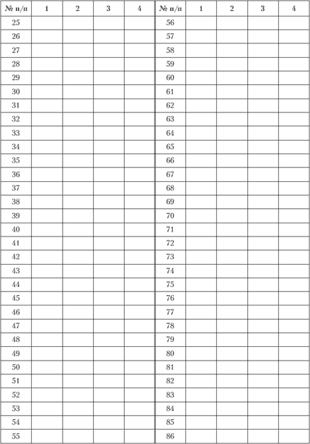 Изучение темперамента человека может быть направленным либо на общую характеристику и определение его типа, либо быть углубленным, ориентированным на изучение свойств. В обоих случаях можно применять весь набор методов психологического исследования. Опросник формально‑динамических свойств индивидуальности (ОФДСИ) (В. М. Русалов) Инструкция. Вам предлагается ответить на 150 вопросов, направленных на выяснение Вашего обычного способа поведения. Постарайтесь представить самые типичные ситуации и дайте первый ответ, который придет Вам на ум. Отвечайте быстро и точно. Помните, что нет «плохих» и «хороших» ответов. Поставьте «крестик» или «галочку» в той графе, которая соответствует утверждению, наиболее правильно описывающему Ваше поведение: – 1 – нехарактерно, – 2 – малохарактерно, – 3 – довольно характерно, – 4 – характерно. 1. Я часто испытываю потребность в движении. 2. Я не ищу новых решений известных проблем. 3. Я постоянно хочу приобретать новые знания. 4. В свободное время я с удовольствием занимаюсь физическим трудом. 5. Я быстро считаю в уме. 6. Я сильно переживаю, когда сдаю экзамен менее успешно, чем ожидал(а). 7. Я предпочитаю уединение большой компании. 8. Мне легко одновременно выполнять несколько дел, например смотреть телевизор и читать. 9. Мне легко выполнять умственную работу, требующую длительного внимания. 10. Я переживаю, когда выполняю задание не так, как следовало бы. 11. Я легок(ка) на подъем. 12. Я огорчаюсь, когда обнаруживаю свои ошибки при выполнении интеллектуальной работы. 13. Я легко переключаюсь с одного дела на другое, занимаясь ручной работой. 14. Я быстро решаю арифметические задачи. 15. Я без труда включаюсь в разговор. 16. Я – подвижный человек. 17. Я устаю от длительной умственной работы. 18. Я легко переключаюсь с решения одной проблемы на другую. 19. Я предпочитаю быструю ходьбу. 20. Моя речь медленна и нетороплива. 21. Я часто высказываю свое мнение, не подумав. 22. Я огорчаюсь, если мне не удается что‑то смастерить самому(ой). 23. Я люблю интеллектуальные игры, в которых требуется быстрое принятие решения. 24. Я испытываю неудобство из‑за того, что у меня плохой почерк. 25. Я часто испытываю опасение оттого, что могу не справиться с работой, требующей умственного напряжения. 26. Я – ранимый человек. 27. Я неохотно выполняю срочную умственную работу. 28. Я часто не могу заснуть оттого, что мне не удается найти решение какой‑либо проблемы. 29. Я всегда выполняю свои обещания независимо от того, удобно мне это или нет. 30. Я огорчаюсь, поспорив с друзьями. 31. У меня портится настроение, когда я долго не могу решить какую‑либо проблему. 32. Мне легко заниматься физическим трудом длительное время. 33. Я чувствовал(а) бы себя дискомфортно, если бы на длительное время был(а) бы лишен(а) возможности общения людьми. 34. Я никогда не опаздывал(а) на свидание или на работу. 35. У меня много друзей и знакомых. 36. Я регулярно читаю о новых достижениях науки и техники. 37. Я сильно волнуюсь перед предстоящим экзаменом. 38. Обычно мои мысли текут неторопливо. 39. Мне нравится мастерить вещи своими руками. 40. Я успешно выполняю работу, требующую тонких и скоординированных движений. 41. Мне легко готовиться к нескольким экзаменам одновременно. 42. Бывает, что я говорю о вещах, в которых не разбираюсь. 43. Моя речь часто опережает мои мысли. 44. Я склонен(на) преувеличивать с